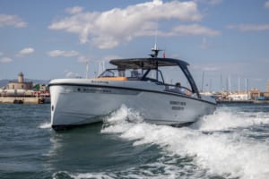 Ya está disponible en Mallorca esta impresionante Saxdor 320 GTO. La llevamos a dar una vuelta en el Salón Náutico Internacional de Palma este mes, y tomamos algunas imágenes con la hermosa catedral de Palma de fondo. En este entorno, la 320 GTO se siente realmente como en casa y puede ser llevada al límite en el agua - ¡qué paseo tan estimulante!